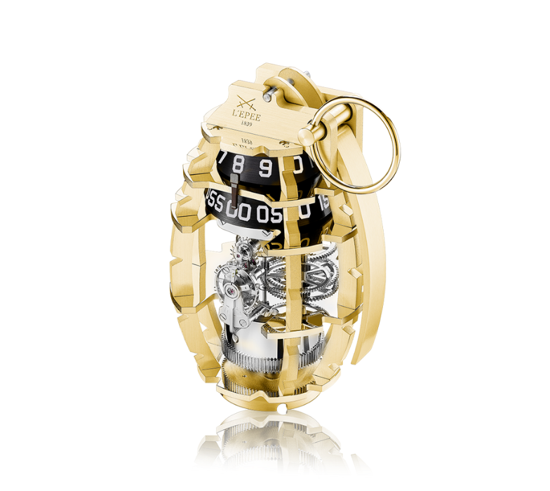 Grenade is modelled after the historical MKII grenade with an M6A4C fuse that uses a pin that is pulled to activate the explosive. In a similar way, the L’Epée 1839 Grenade features a pin that doubles as the key, which when pulled allows for setting the time and winding the eight-day movement. The moment you pull the pin on a grenade the mind is focused: the grenade is live, and you must concentrate on the here and now to survive.